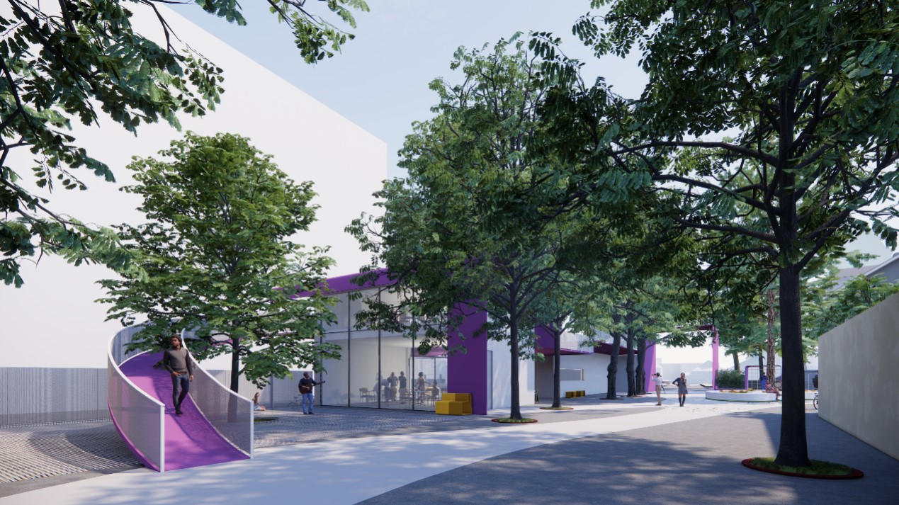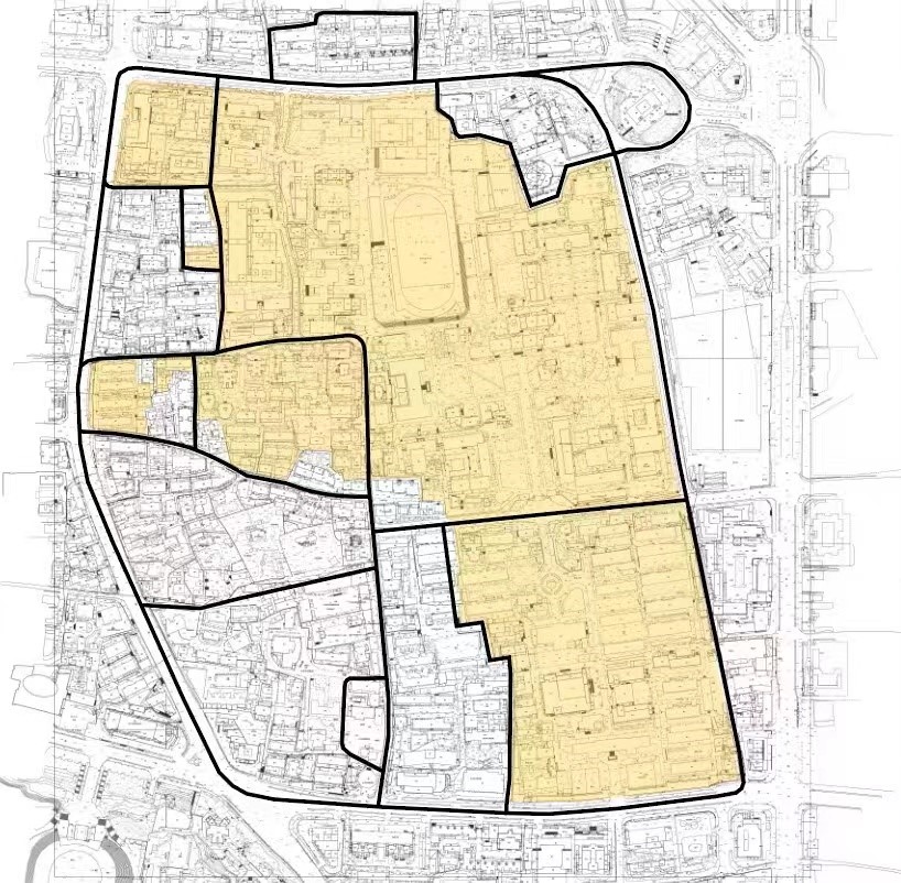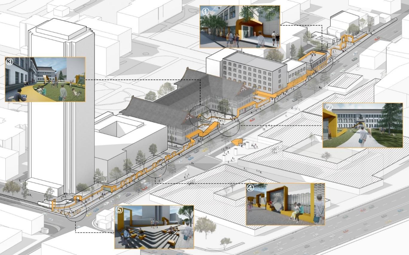 Open the western boundary between Yifu Building and Jianliang Building to widen the sidewalk and divert pedestrians and vehicles. Landscape and exhibition space are created by using the greening and open space at the campus, and functions such as self-study, reading and sightseeing are added by using the roof space. Each function is guided and connected through the ground color painting, which solves the traffic issues and realizes the linkage with the historical buildings of Jinyin Street.