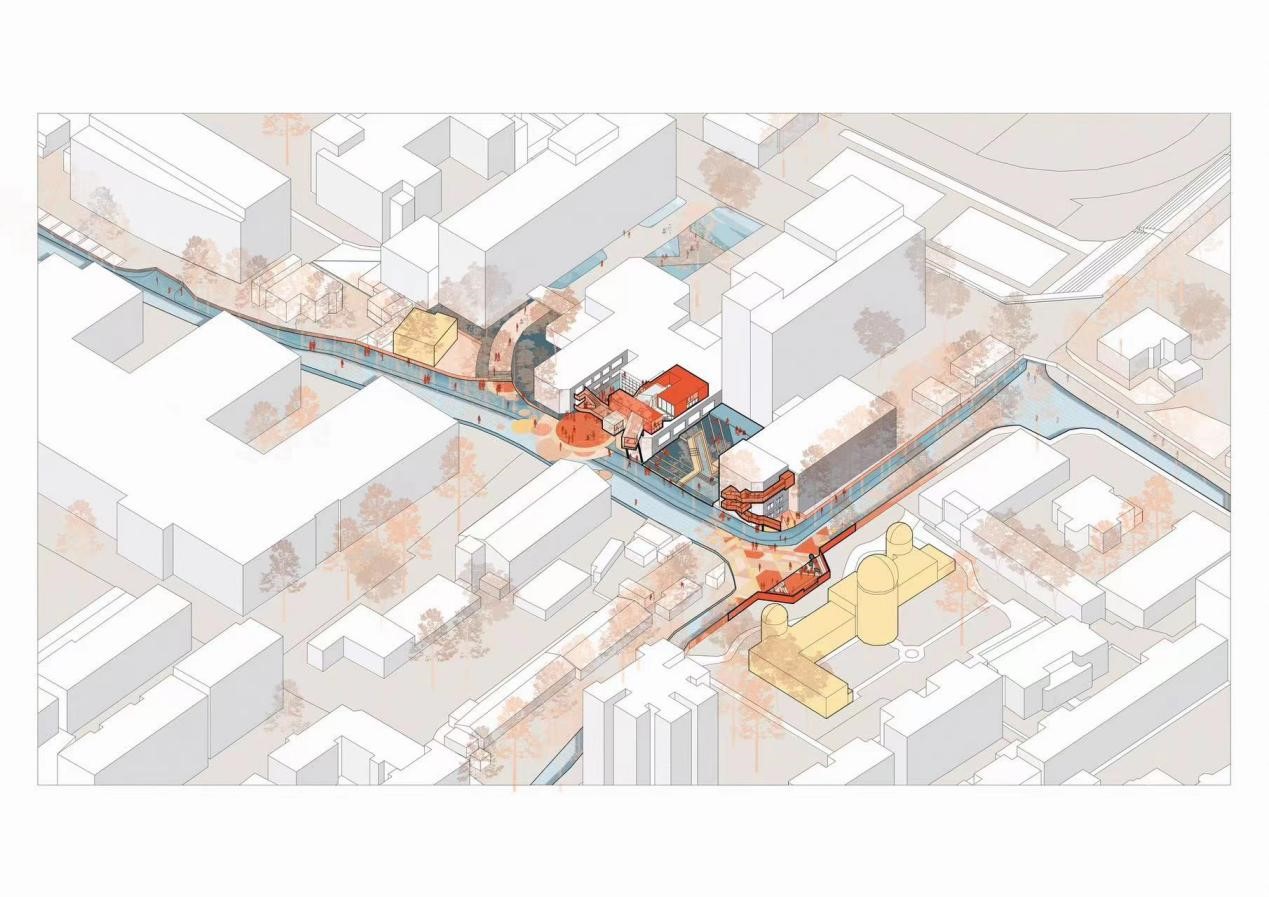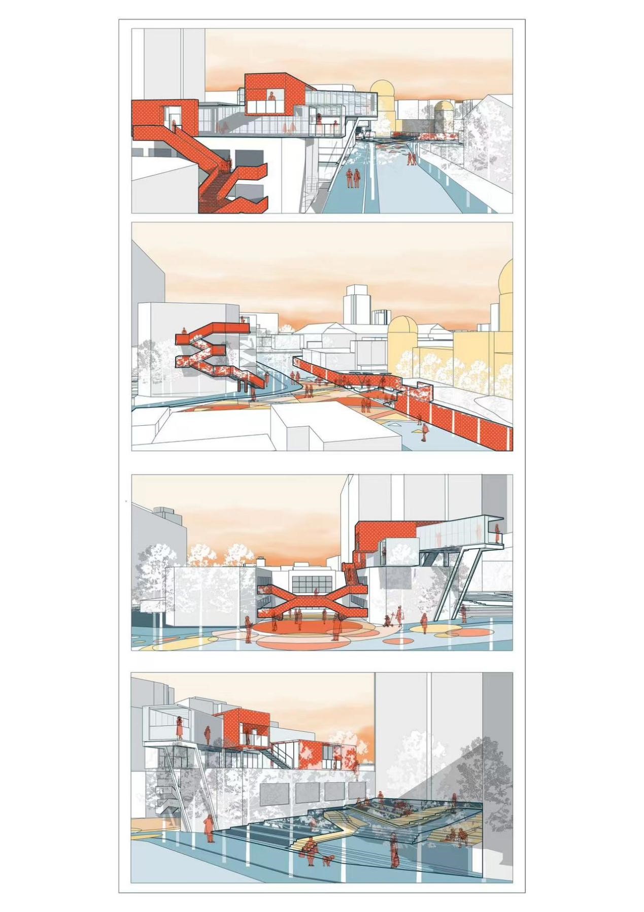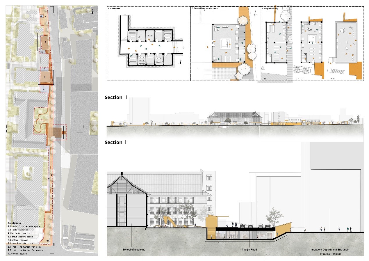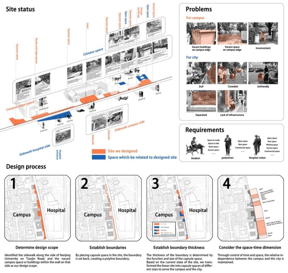 The site of our design is the west gate of Nanjing University. Our design concept is to thicken and bend the wall that symbolizes isolation and closure, make the boundary invisible, become a space and implant a variety of functions, open to the city, provide the city with a window to observe, integrate into and use the campus. In the design process, we use the roof space to add a multi-level walkway system, so that people outside the campus can observe the historic buildings and feel the campus atmosphere from the height; At the same time, we changed the road inside the site into a sidewalk to close the traffic flow and create more possibilities for crowd movement in the space.