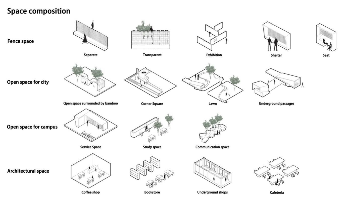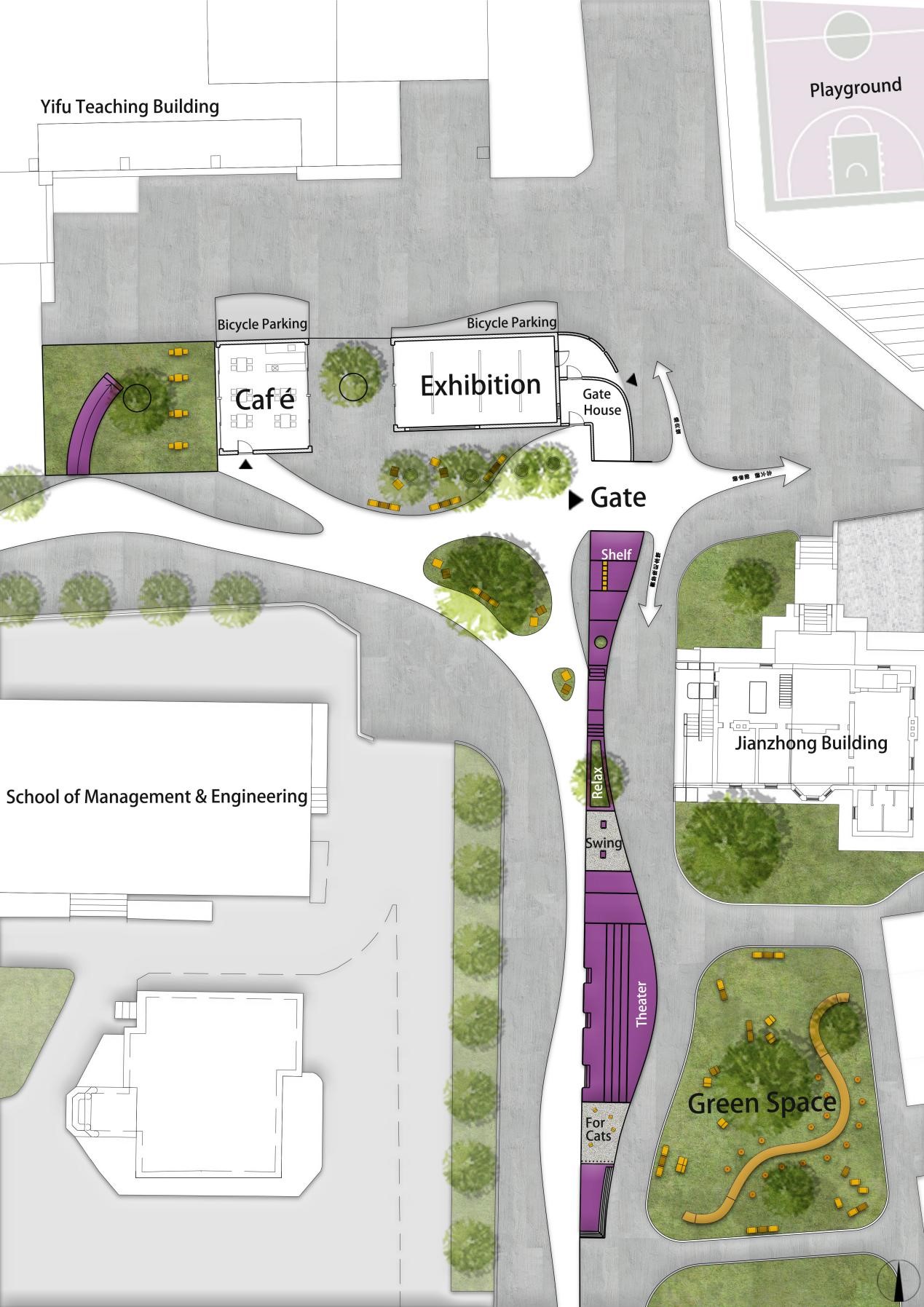 The site is located on the east edge of the North Campus of Nanjing University and the sidewalk of Tianjin Road. The low utilization of the campus edge space and the narrow, congested sidewalk are the two major issues of the site. We aim to energize the street by moving the wall back while connecting the street interface with a three-dimensional curved strip. The shape of this strip is free and changeable, and the location is also created based on the local situation. Combined with the brick wall partition, a series of external or internal U-shaped Spaces are enclosed, so that the campus edge space can be used as an open and inclusive installation of the city.