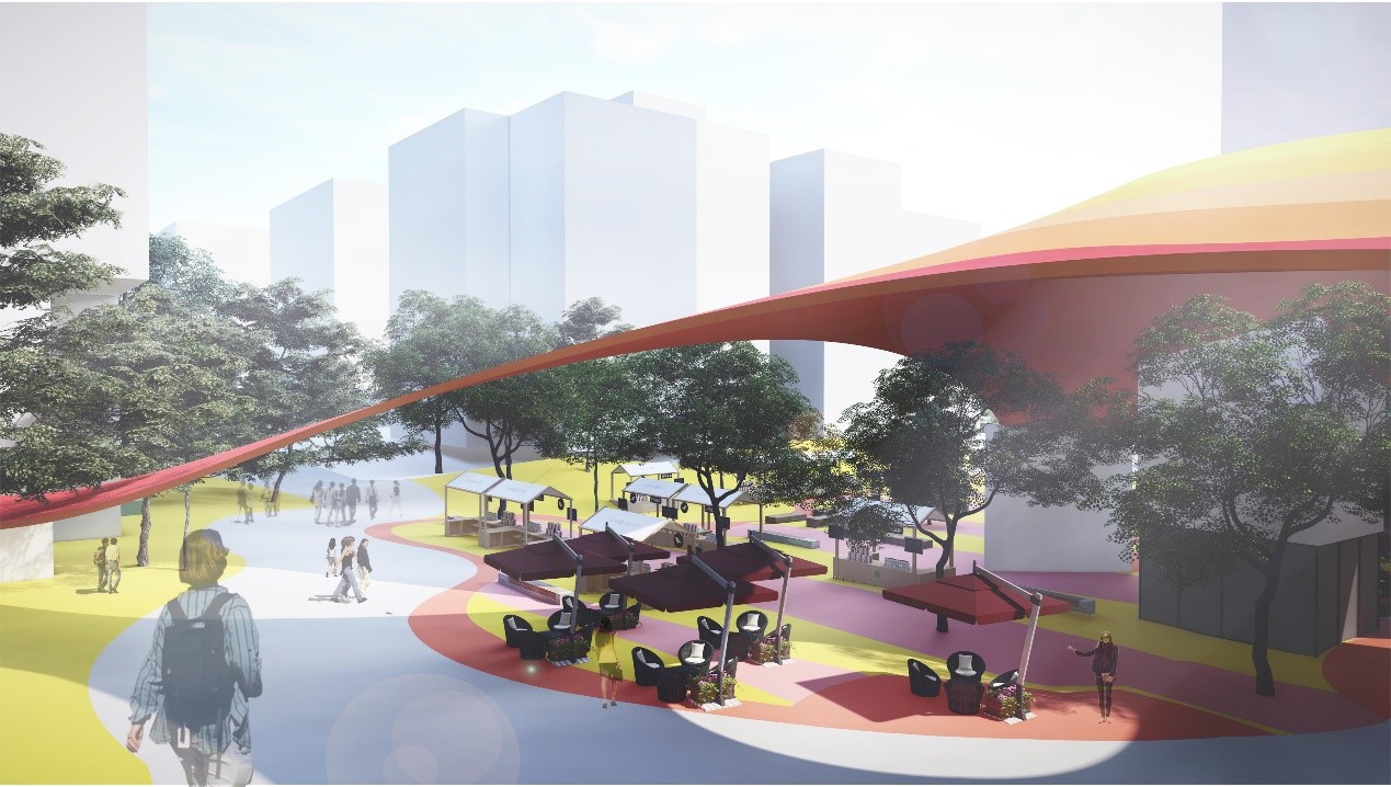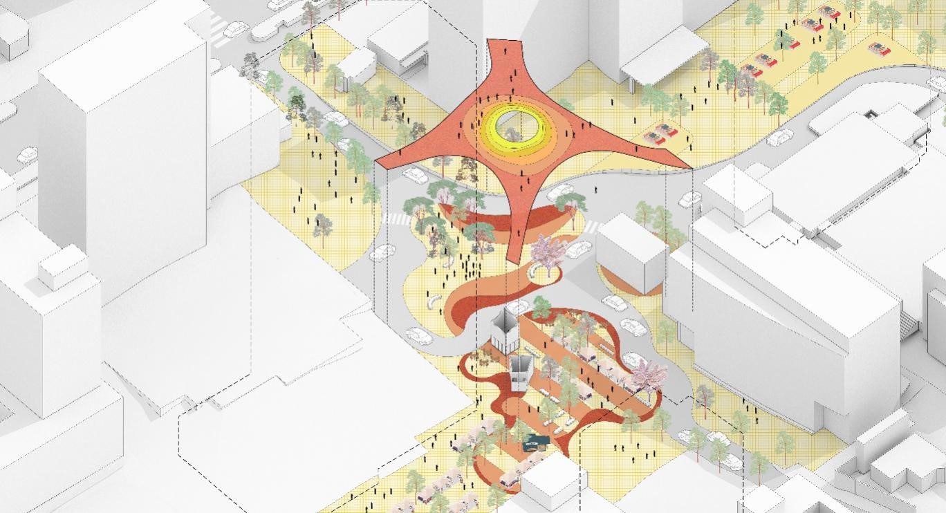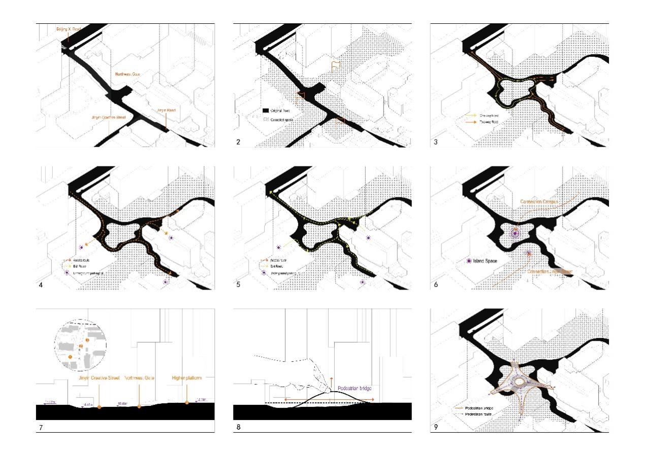 Our design selects the intersection of the northwest gate of Nanjing University Gulou Campus and the north side of Jinyin Road. We propose the concept of "Claim the Space" to emphasize the priority of walking. Initially, the site is prioritized for walking, and then the road for vehicles is re-planned. The lanes are moved to the edge, and the useless plots on both sides of the road are concentrated in the middle to form a roundabout. Using the original height difference of the site, the campus on both sides of Jinyin Road is connected through the "arch bridge", and the bridge is used as the new school gate to enhance the identification.