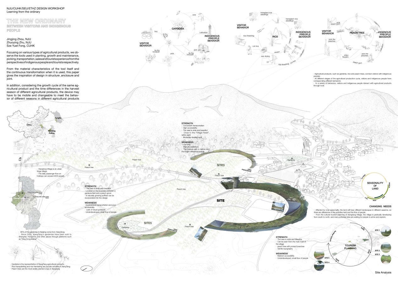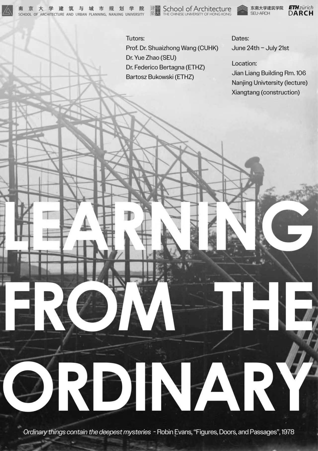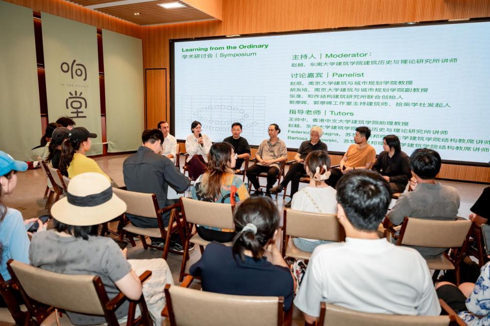 The "Learning from the Ordinary" design workshop, jointly directed by Nanjing University, the Chinese University of Hong Kong, Southeast University and ETH Zurich, Switzerland, was officially launched on June 24, 2024, and ended successfully on July 19, 2024.This workshop aims to combine the elements of everyday life with the concept of circular construction and explore a sustainable building design method in the ground.This joint design workshop is also part of the 2024 "Rural Revitalization Workshop in Suzhou, Hong Kong and Macau" initiated and hosted by the School of Architecture and Urban Planning, Nanjing University.During the four-week workshop, four tutors worked with 12 students from the Department of Architecture of Nanjing University and the Chinese University of Hong Kong on the design and construction of a space installation in Xiangtang Village, Nanjing.After 15 days of analysis and design and 5 days of on-site construction, the final result of the workshop, A Pavilion, was completed on the slope of the north side of Xiangtang Village.On July 19, a number of professors and experts conducted an academic discussion on this achievement.The results of the workshop will be exhibited until July 26.