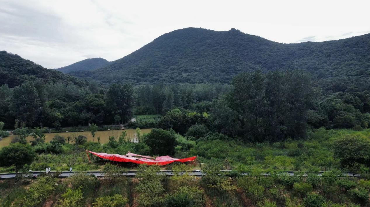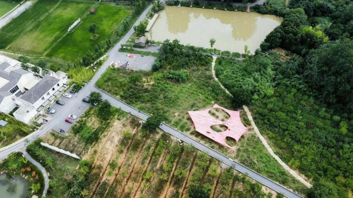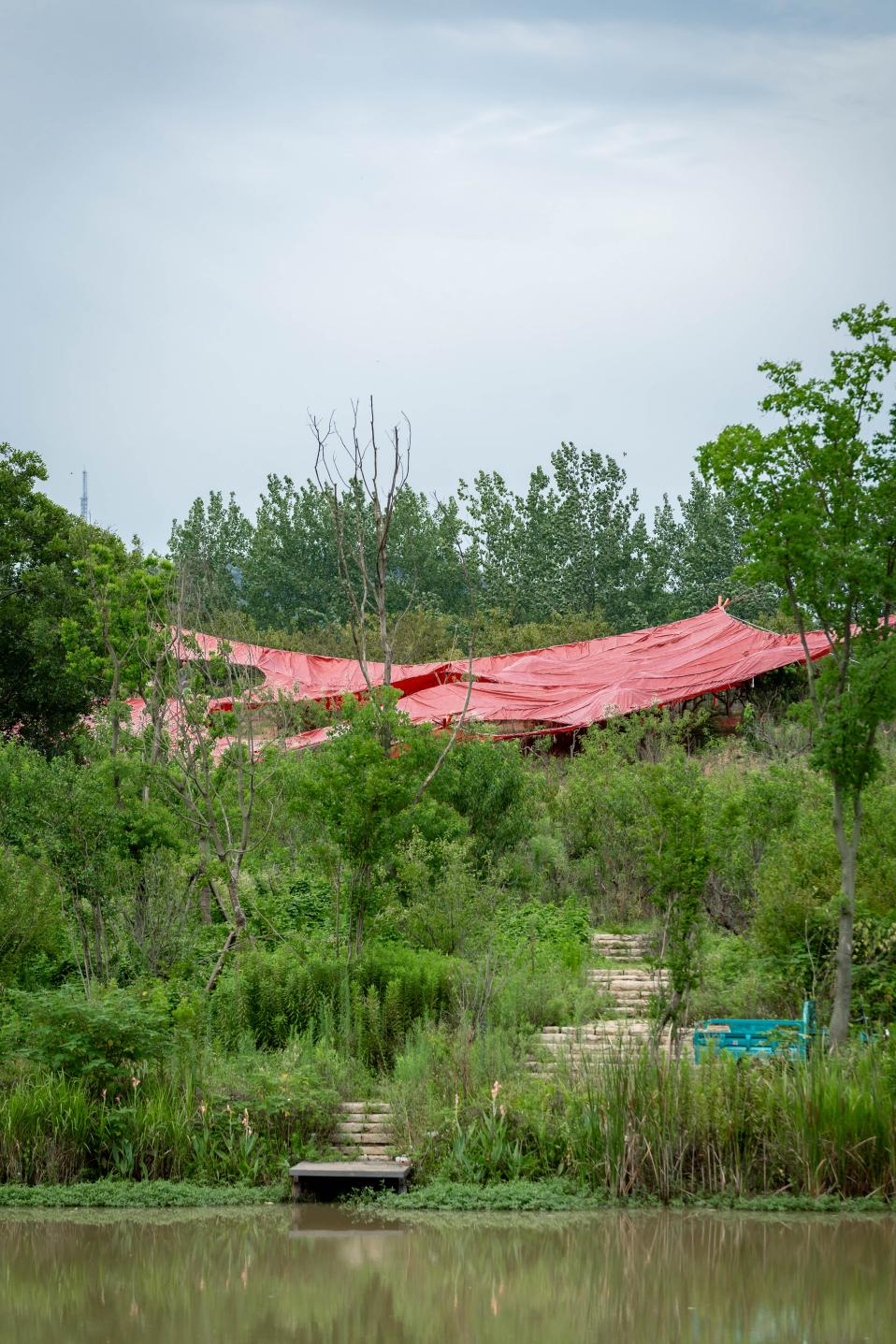 Red Canopy is located on the northern slope of Xiangtang in Pukou, Nanjing. It is an enormous floating structure made of bamboo of varying thickness and woven fabric, aiming to respond to the natural, historical, and social environment of Xiangtang on a topographical scale. Covering an area of 750 square meters, the pavilion, with its exceptional size, form, and color, adds a distinctive character to the silent site, revealing the yet undiscovered poetry of the slope.