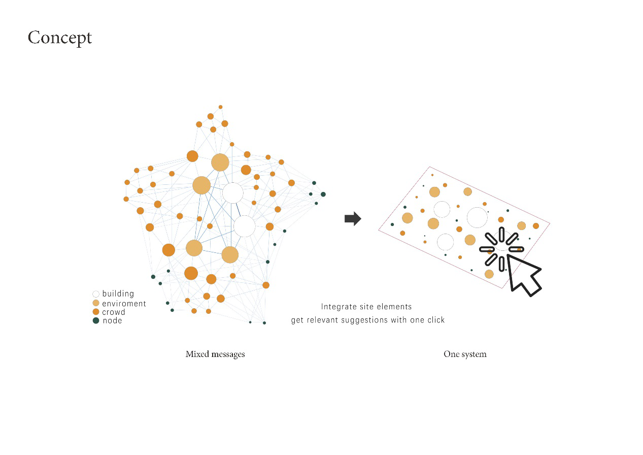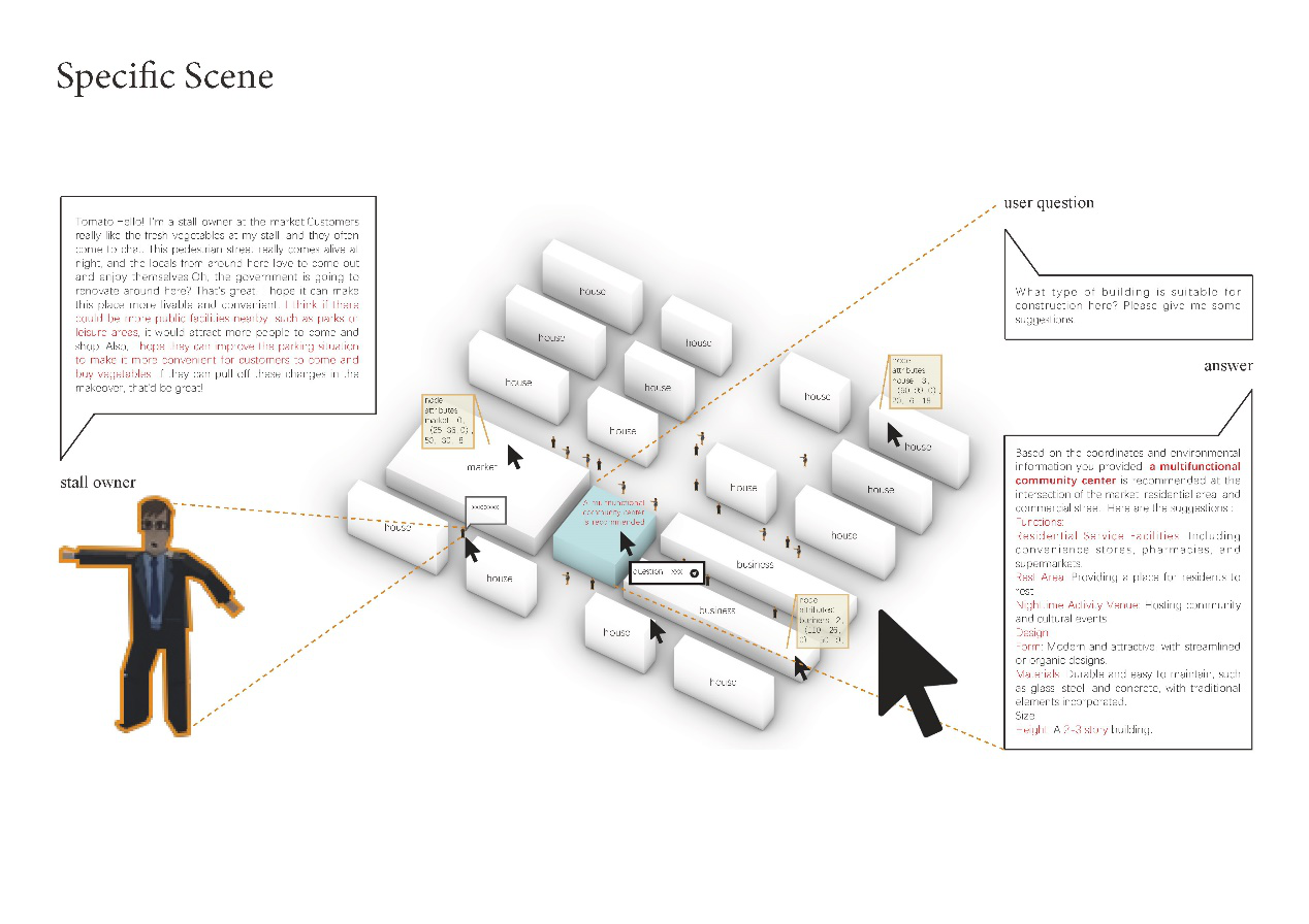 Based on the traditional physical space model, textual information such as crowd policies and norms is integrated. By clicking on any point and inputting user questions, design suggestions can be provided.