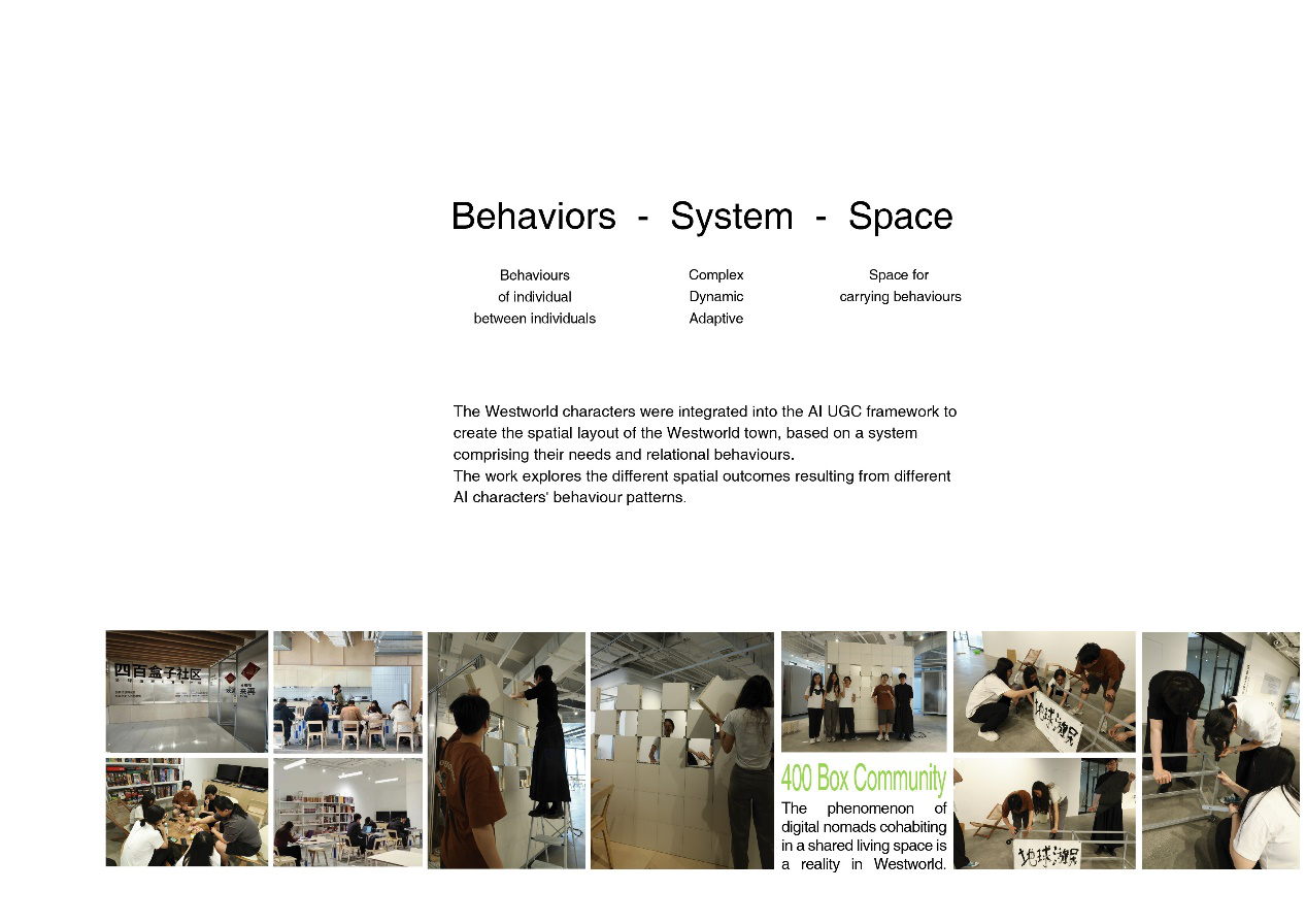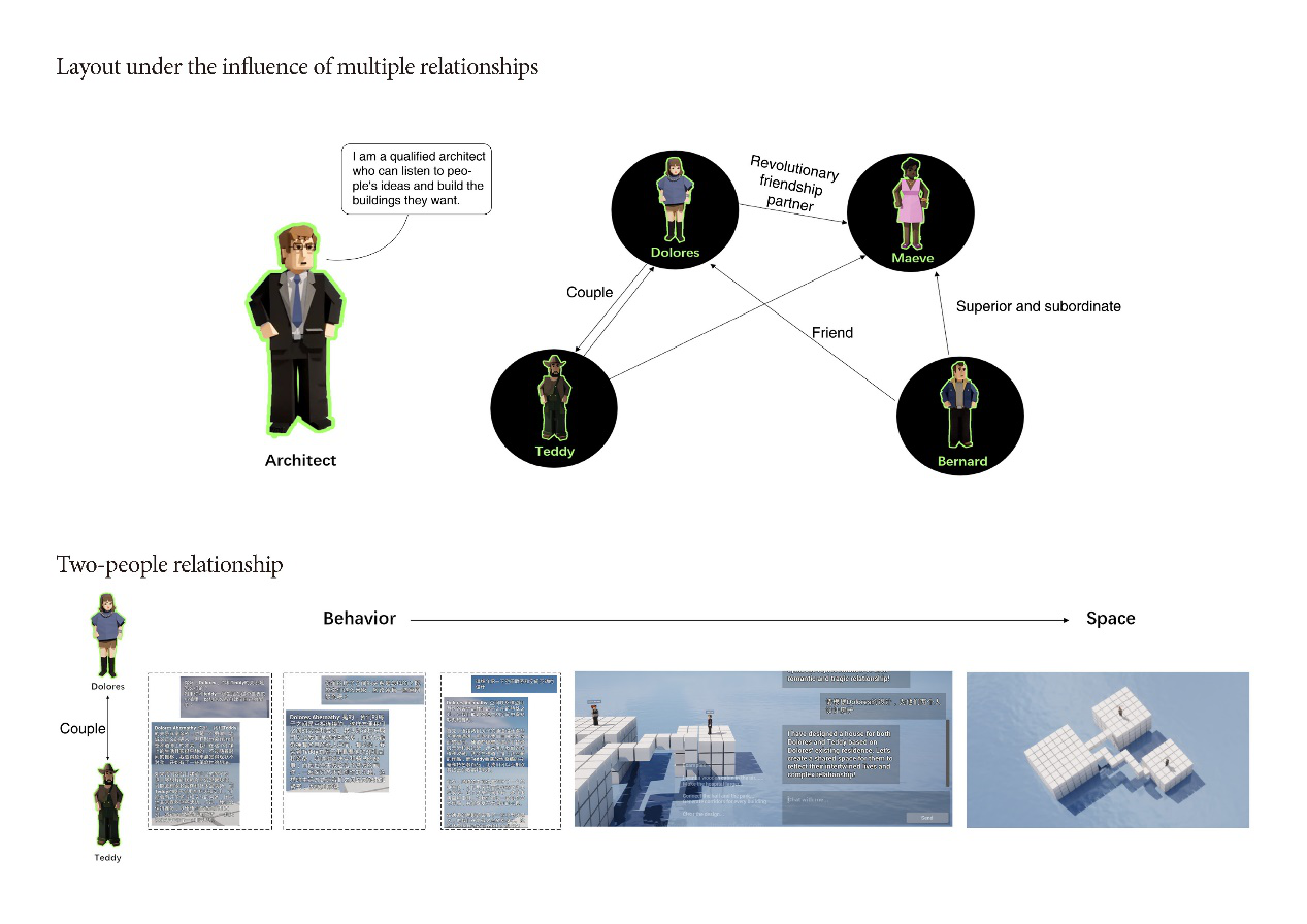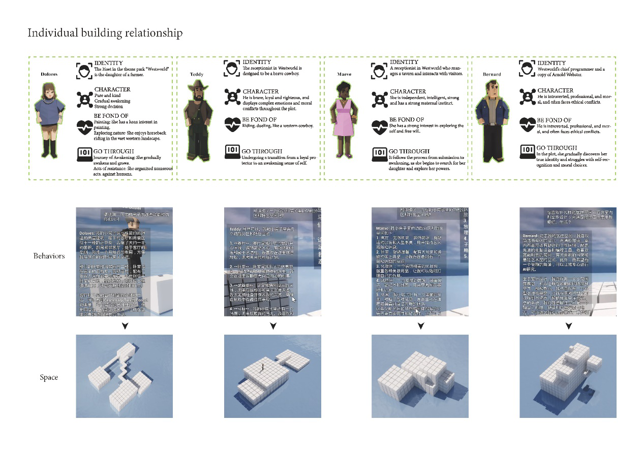Characters from the series "Westworld" were placed within the AI UGC framework we provided, cohabiting with the characters of "Westworld" and constructing the "Westworld" town themselves. From behavior to systems to spatial layout, the exploration delved into the different spatial outcomes resulting from the distinct behavioral patterns of various AI characters.