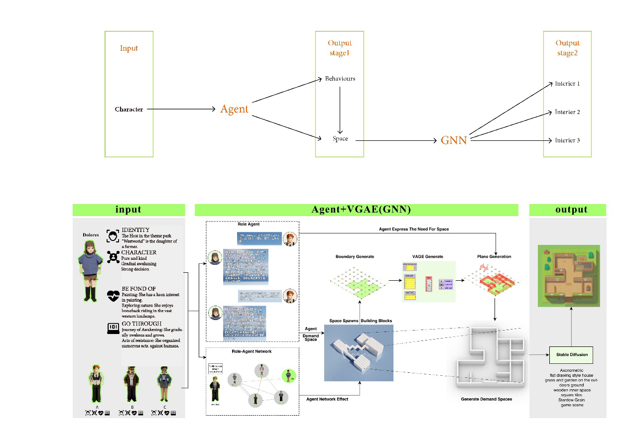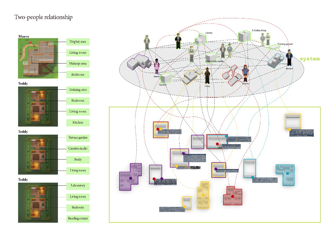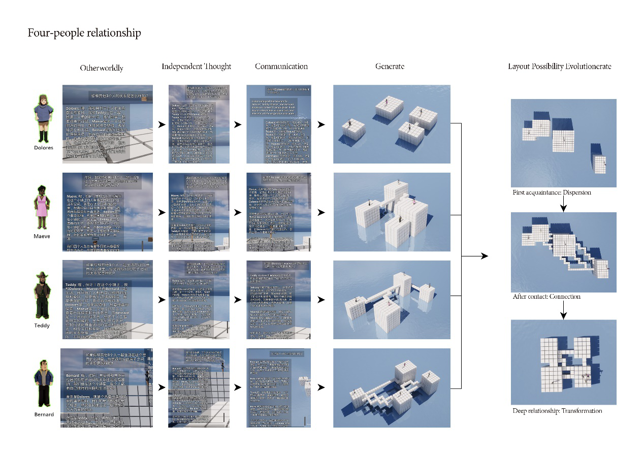Characters from the series "Westworld" were placed within the AI UGC framework we provided, cohabiting with the characters of "Westworld" and constructing the "Westworld" town themselves. From behavior to systems to spatial layout, the exploration delved into the different spatial outcomes resulting from the distinct behavioral patterns of various AI characters.