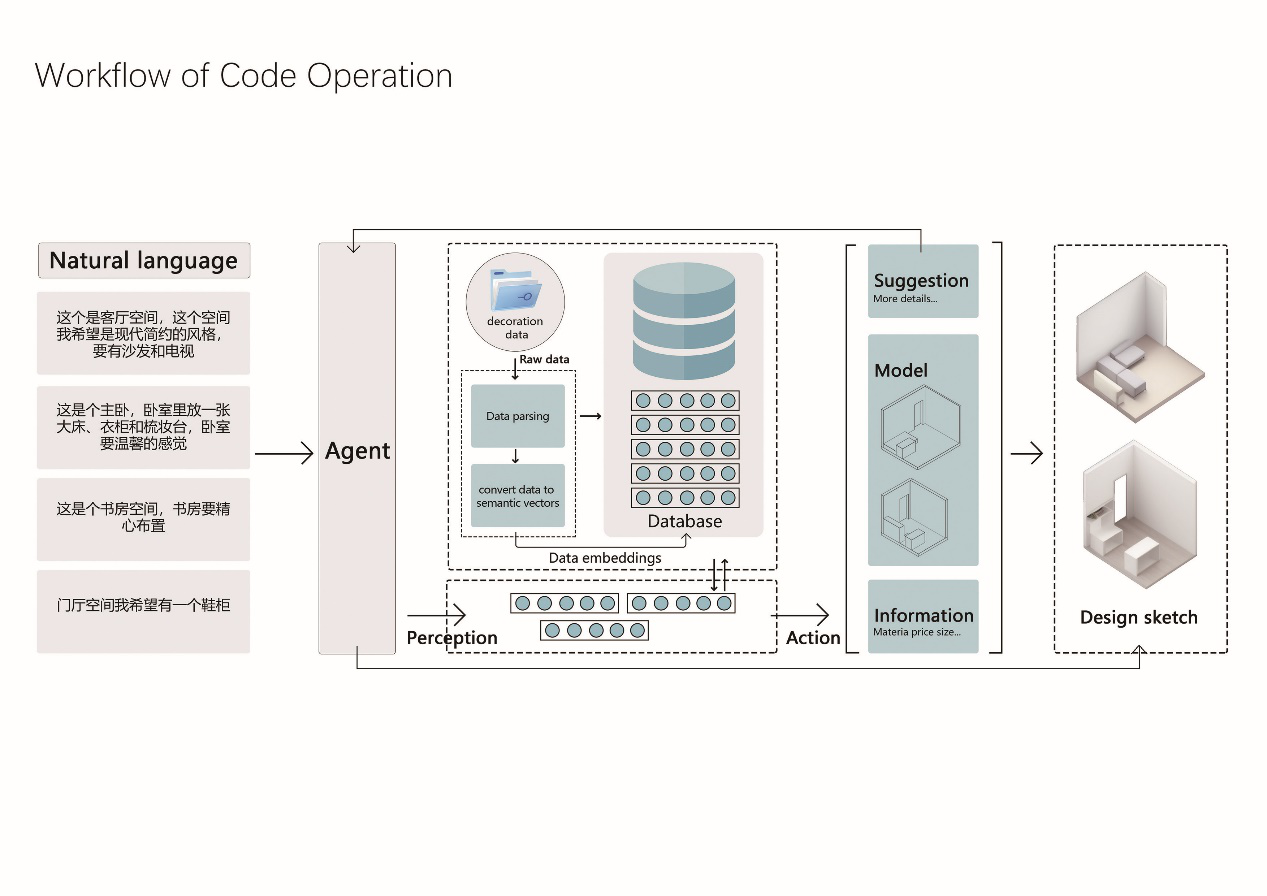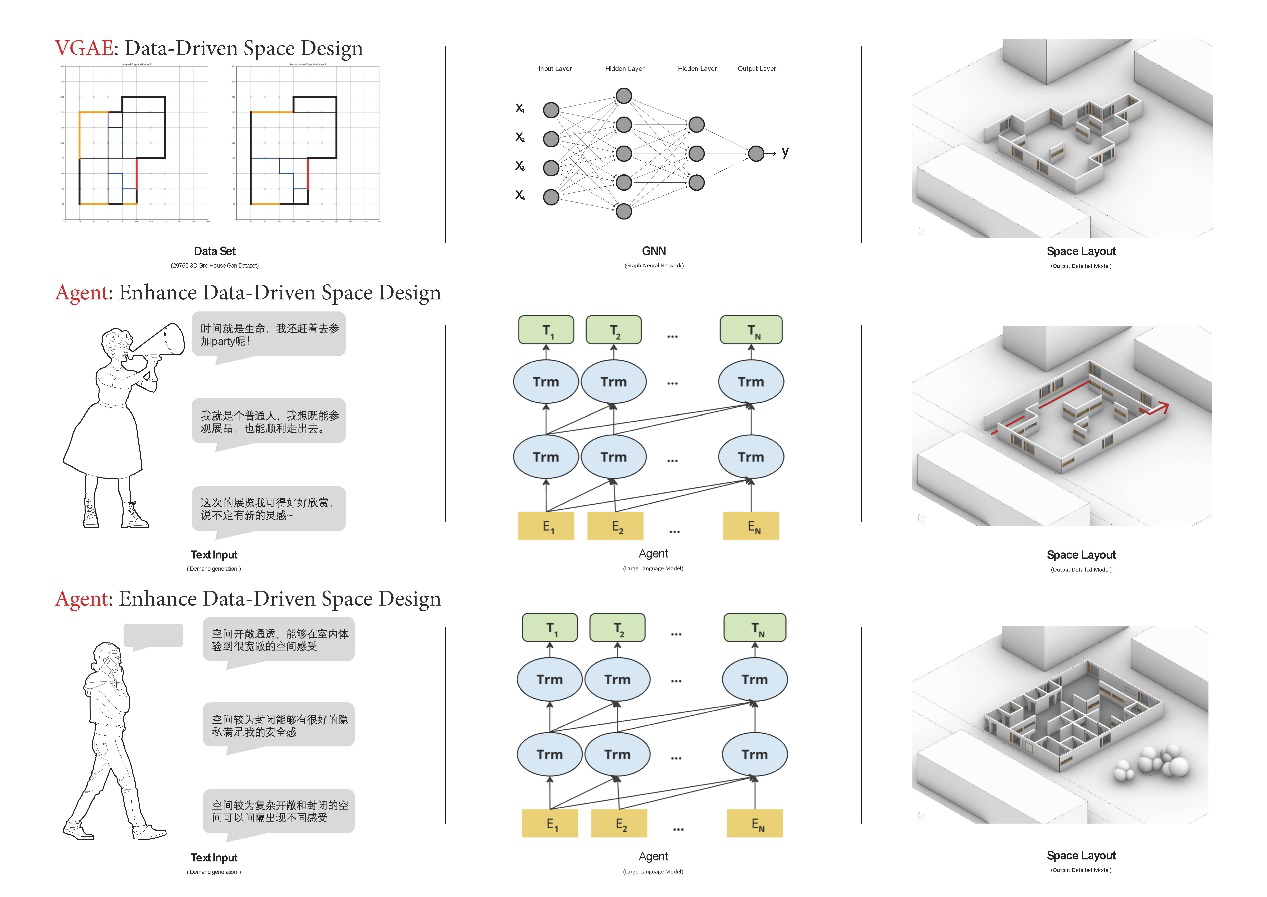 Convey your feelings and needs in a single sentence to influence the form and specific design of the space. Modify the data bias in the results generated by the graph neural network. Link the features of the agent with those of the graph network.