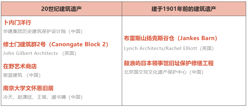 该项目从中英两国青年建筑师的建筑遗产保护实践中征集到了大量杰出案例,并分为20世纪建筑遗产修缮改造和1901年以前建造的建筑遗产修缮改造两类。项目的专家评估小组对两个组别的参赛项目进行了评估,并从本次征集案例中评选出了来自英国和中国大陆的六个遗产保护项目终选案例获奖项目(见下表)以及过去二十年获奖的建筑遗产保护实践中进一步精选出八个获奖案例。最终颁奖礼于2022年10月21日在伦敦举行,由英国皇家建筑师学会前任主席和历史英格兰委员会委员Ben Derbyshire主持并公布最终获奖名单。